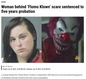 Threatening clowns are nothing new either: In September and October 2016, schools across the country were threatened by clowns. Responses to the threats—many of them originating (or shared) on social media—resulted in increased police patrols and in some cases full lockdowns. For example, police in Flomaton, Alabama, investigated what were deemed credible threats to students at the local high school that were shared via social media. A total of about 700 students at Flomaton High School and nearby Flomaton Elementary School were told to shelter in place while the schools, following protocol, were placed on lockdown for much of the day while dozens of police and other law enforcement officers searched the grounds for threats. The threats had originated from two Facebook accounts, “FLOMO KLOWN” and “Shoota Cllown”; the digital trail led FBI investigators to one adult and two teens. Twenty-two year old Makayla Smith was arrested for making a terroristic threat while posting as an evil clown and sentenced to five years of probation.