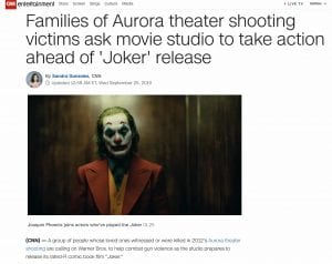 It’s not just the FBI that’s concerned. As CNN reported, “A group of people whose loved ones witnessed or were killed in 2012’s Aurora theater shooting are calling on Warner Bros. to help combat gun violence as the studio prepares to release its rated-R comic book film Joker. In a letter addressed to Warner Bros. CEO Ann Sarnoff and obtained by CNN, five family members and friends of victims of the movie theater shooting in Aurora, Colorado ask the studio to ‘use your massive platform and influence to join us in our fight to build safer communities with fewer guns … . Over the last several weeks, large American employers from Walmart to CVS have announced that they are going to lean into gun safety. We are calling on you to be a part of the growing chorus of corporate leaders who understand that they have a social responsibility to keep us all safe.’”