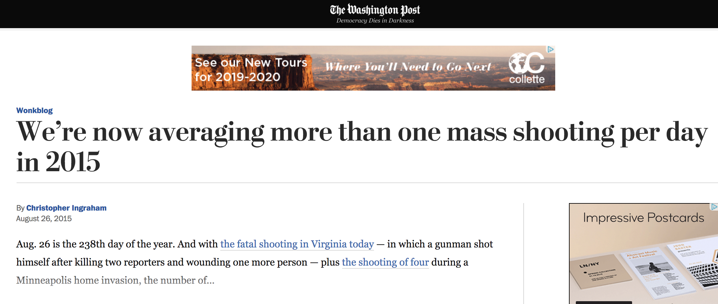 The Washington Post’s Christopher Ingraham wrote on August 26, 2015, that “We’re now averaging more than one mass shooting per day in 2015.” The New York Times headlined on December 2, 2015, “How often do mass shootings occur? On average, every day, records show.”