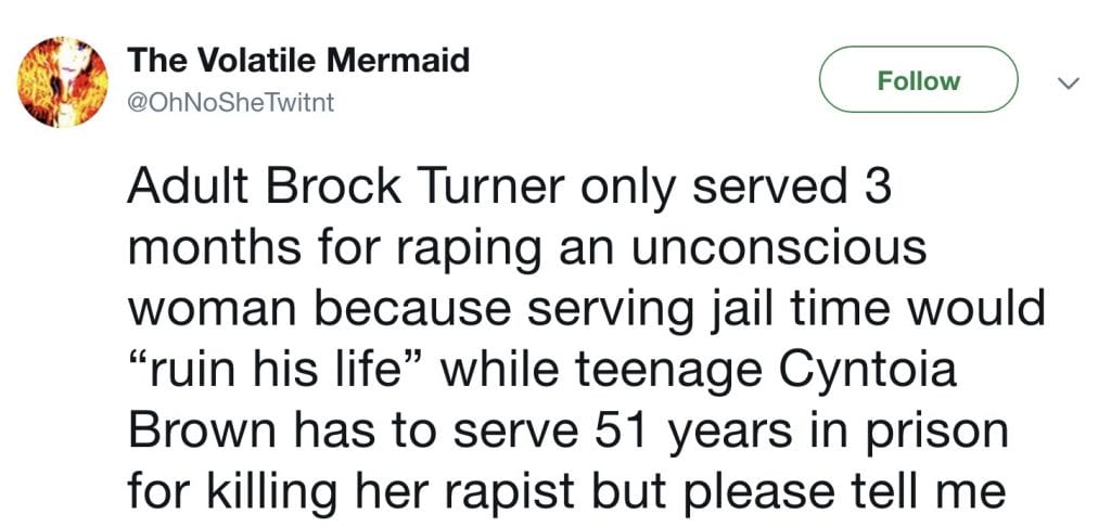 A widely-shared meme on December 9, 2018 stated that “Adult Brock Turner only served 3 months for raping an unconscious woman because serving jail time would ‘ruin his life,’” and compared his sentence to the case of teenager Cyntoia Brown, who was sentenced to 51 years in jail for murder but later granted clemency and released after serving 15 years for the killing. There are of course real racial sentencing discrepancies (despite the significant differences between these two cases), but part of the message is demonstrably false.