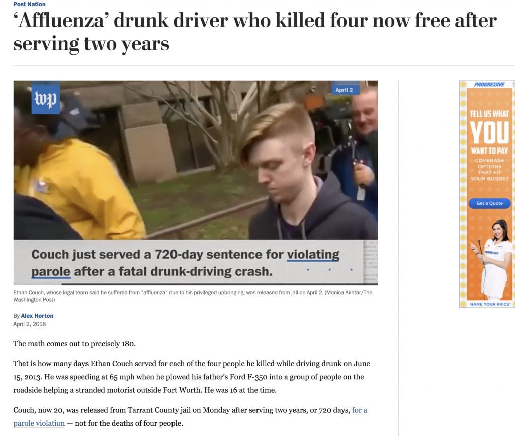 Examples include Ethan Couch, a Texas teenager who in 2013 caused a drunk-driving accident that killed four people and seriously injured two others. His defense infamously argued that Couch suffered from “affluenza,” an imaginary condition brought about by his privileged childhood in a wealthy family in which he didn’t—and presumably couldn’t be expected to—understand the consequences of his actions. Couch was sentenced to ten years of probation, spawning outraged headlines and commentary.