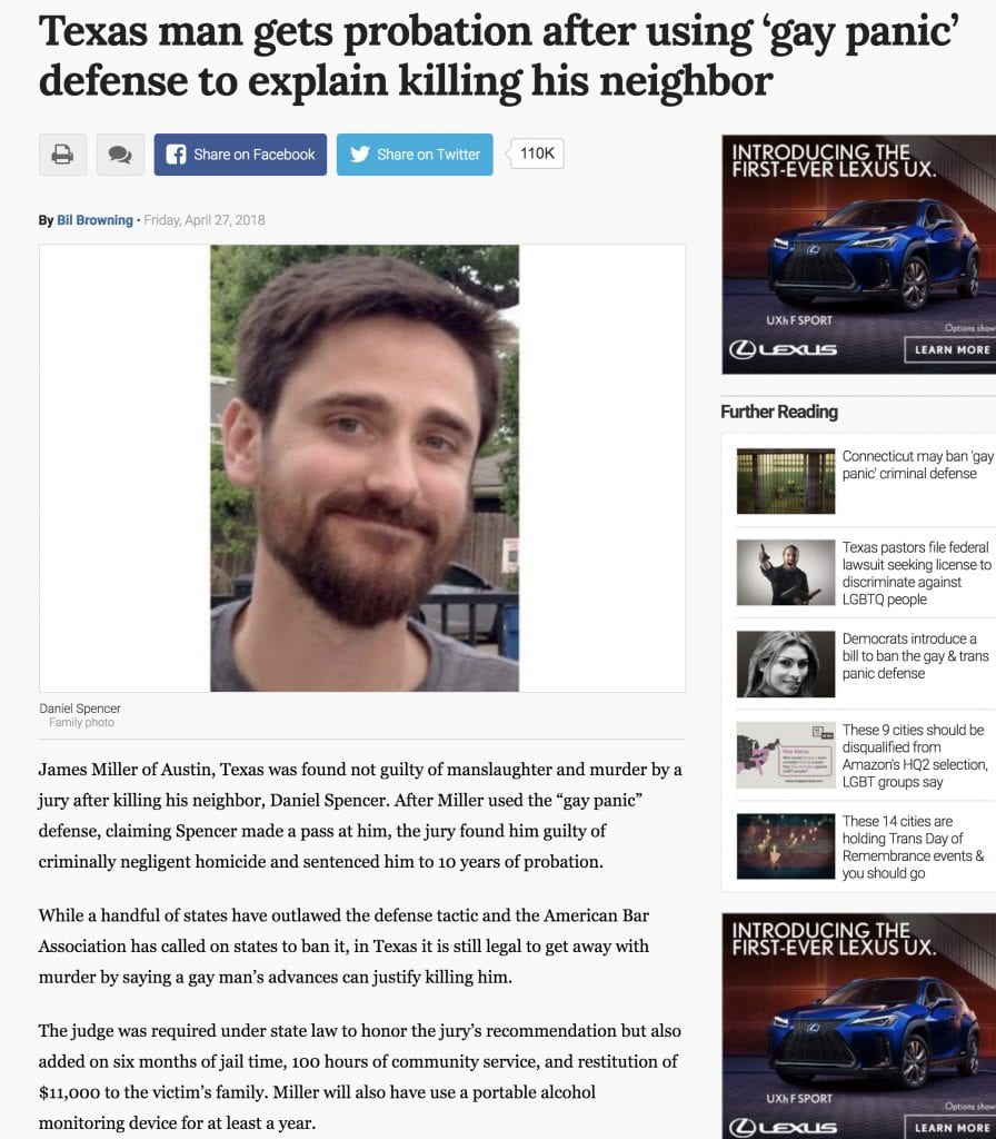 In an article by Bil Browning for LGBTQNation headlined “Texas Man Gets Probation after Using ‘Gay Panic’ Defense to Explain Killing his Neighbor” noted that “James Miller of Austin, Texas was found not guilty of manslaughter and murder by a jury after killing his neighbor, Daniel Spencer. After Miller used the ‘gay panic’ defense, claiming Spencer made a pass at him, the jury found him guilty of criminally negligent homicide and sentenced him to 10 years of probation.”