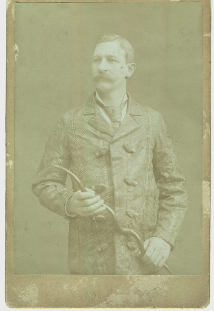Among the old-time snake hunters and peddlers of rattlesnake oil was Peter “Rattlesnake Pete” Gruber (1858–1932) (see first photo). As related in Arch Merrill’s Shadows on the Wall (1952), Pete was born in Oil City, Pennsylvania, the eldest of a pioneer oil refiner’s nine children. He would later claim, that, while a boy hiking in the local hills, he had come upon an old Indian woman from the Seneca reservation. Dragging behind her on a rope a big dead rattlesnake, she explained to Pete how she would extract the fatty oil, which was used to treat rheumatism, stiff joints, even earache—among other afflictions. Impressed by the boy’s interest, she even gave him the snake’s skin. Pete later learned from the Indians how to capture the rattlers, and from the medicine men how to use them for various folk remedies.