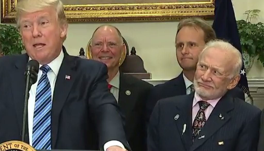 On June 30 2017, Trump signed an executive order to re-establish the National Space Council, which had been defunct since 1993. During the event Apollo 11 astronaut Buzz Aldrin had a brief and bizarre exchange: “We know what this is, space,” said the U.S. president. “That’s all it has to say: space. There’s a lot of room out there, right?” Trump asked Aldrin. “Infinity and beyond!” Aldrin replied, quoting astronaut Buzz Lightyear in the film Toy Story. Trump responded “It could be infinity. We don’t really don’t know. But it could be. It has to be something—but it could be infinity, right?” Trump spoke from prepared comments including “Today’s announcement sends a clear to the world that we are restoring America’s proud legacy of leadership in space… At some point in the future we will look back and say, ‘How did we do it without space?’” Aldrin visibly grimaced at this and several other bizarre Trumpian nonsequiturs, but remained silent. The fact that Aldrin did not step forward and interrupt the president to refute the nonsense he was hearing does not suggest that he agreed with anything he was hearing. In fact his facial expressions told much of the story.