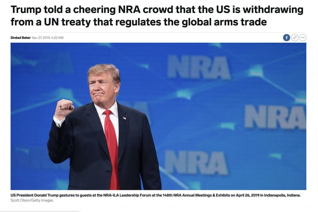 Though simple and transparent, this technique has fooled many on social media, as well as some (otherwise seemingly media-savvy) skeptics and journalists. To choose only one of many examples, Sinead Baker, writing for Business Insider, offered a headline that read, “Trump told a cheering NRA crowd that the US is withdrawing from a UN treaty that regulates the global arms trade.” The headline’s obvious implication: the “cheering NRA crowd” must have firmly approved of Trump’s decision. Of course no one took a poll of the crowd to determine whether the public cheering reflected the genuine beliefs and endorsements of the NRA members in attendance.